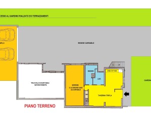 PIANO TERRA – Taverna tripla con angolo cottura, bagno finestrato, lavanderia, ripostiglio e spazioso garage collegato internamente con luminosa vetrata (utilizzabile anche come CAMERA MATRIMONIALE e CABINA ARMADIO), oltre altro GARAGE TRIPLO leggermente discostato dalla casa;